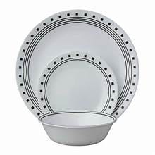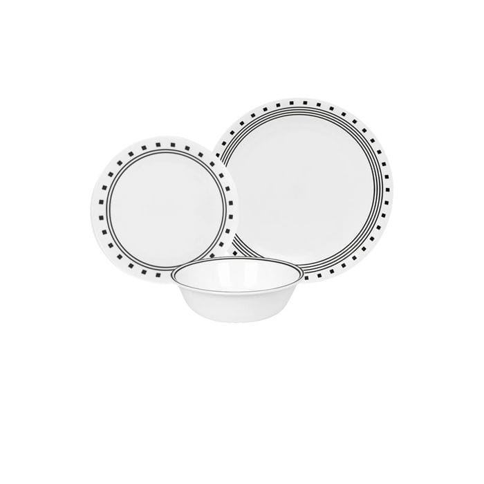 Os quadrados e as riscas arrojadas do Corelle City Block – Serviço louça Vitrelle 18 peças dão a este serviço de jantar a preto e branco o seu toque metropolitano.