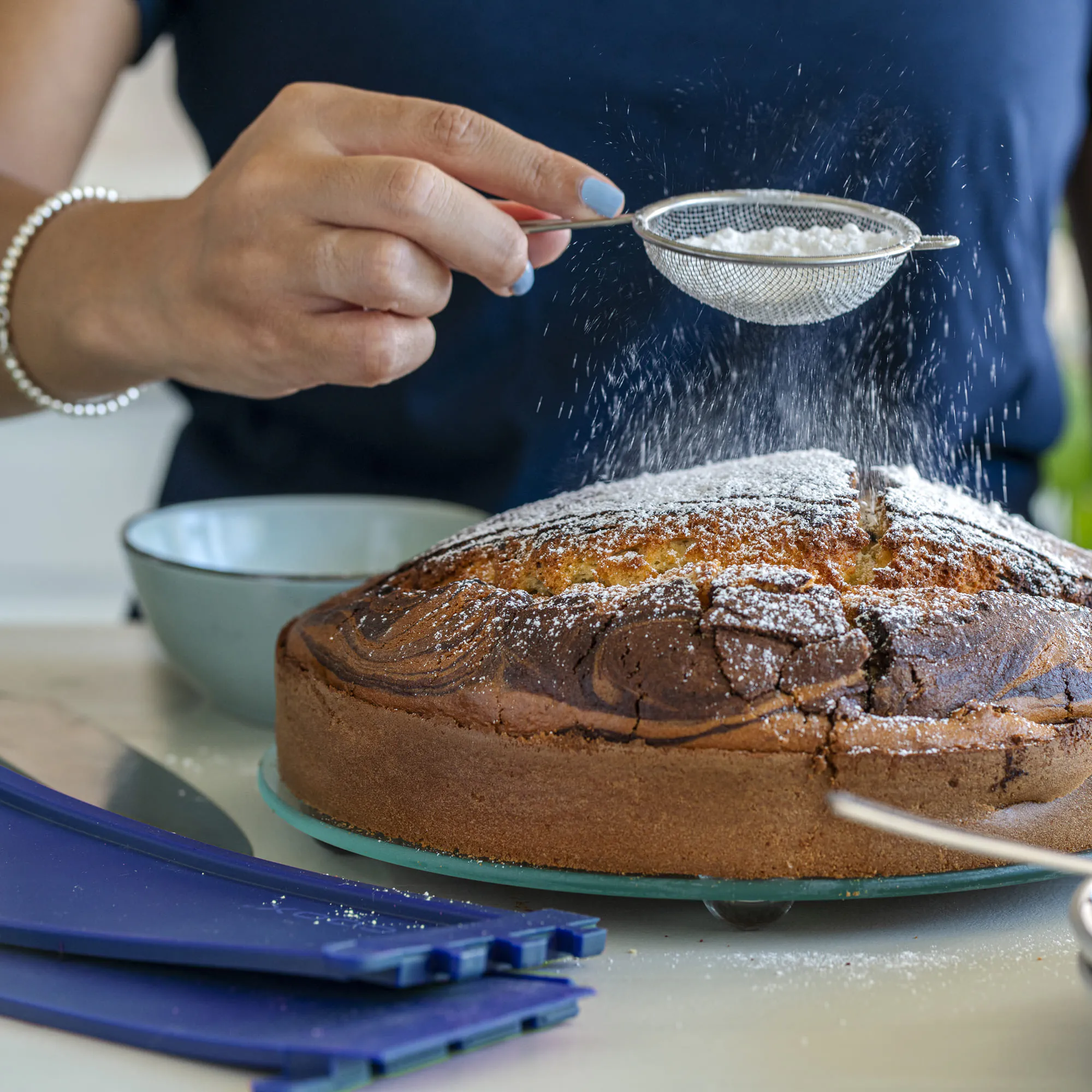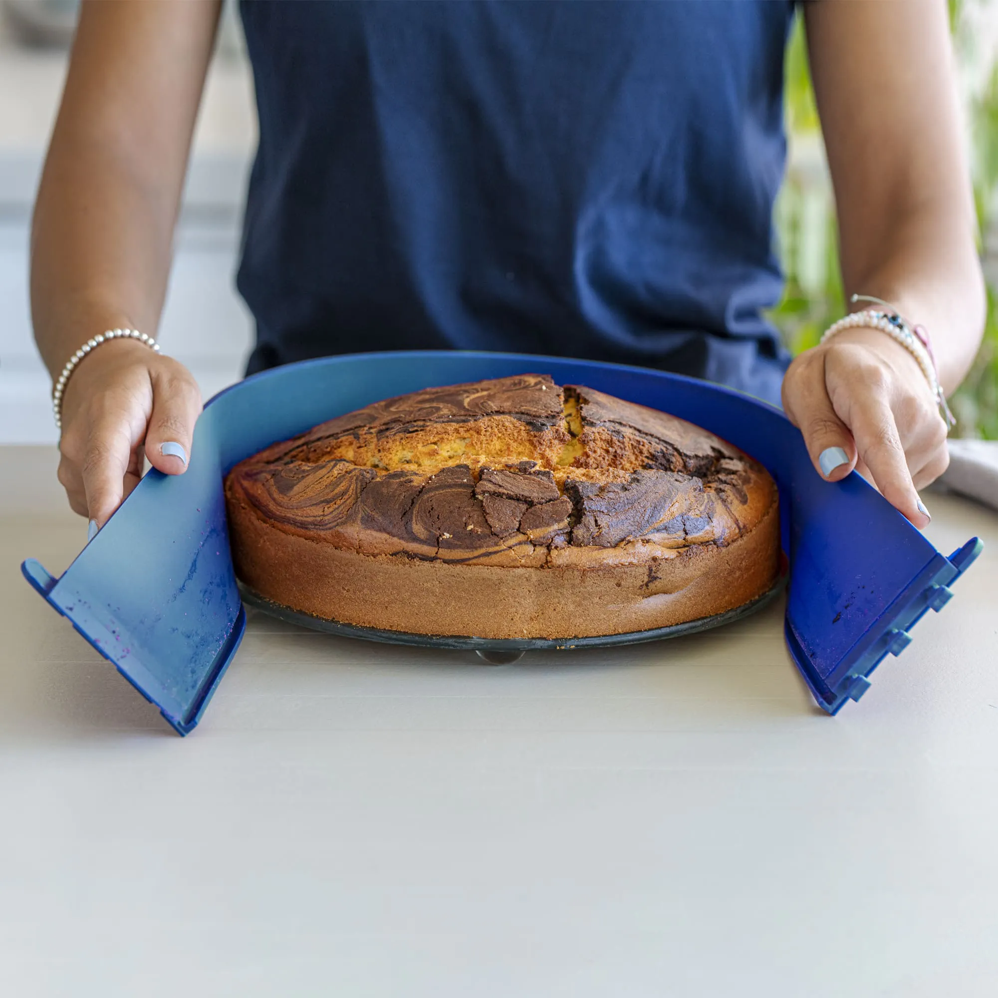 Esta forma distingue‑se por um design inovador que une um anel flexível em silicone antiaderente com um prato de servir em vidro temperado, que também funciona como base de cozedura. Graças a esta combinação, depois de retirar o anel de silicone, o seu bolo ou sobremesa fica imediatamente pronto para cortar e servir — evitando passos desnecessários e facilitando tanto a preparação como o serviço à mesa.