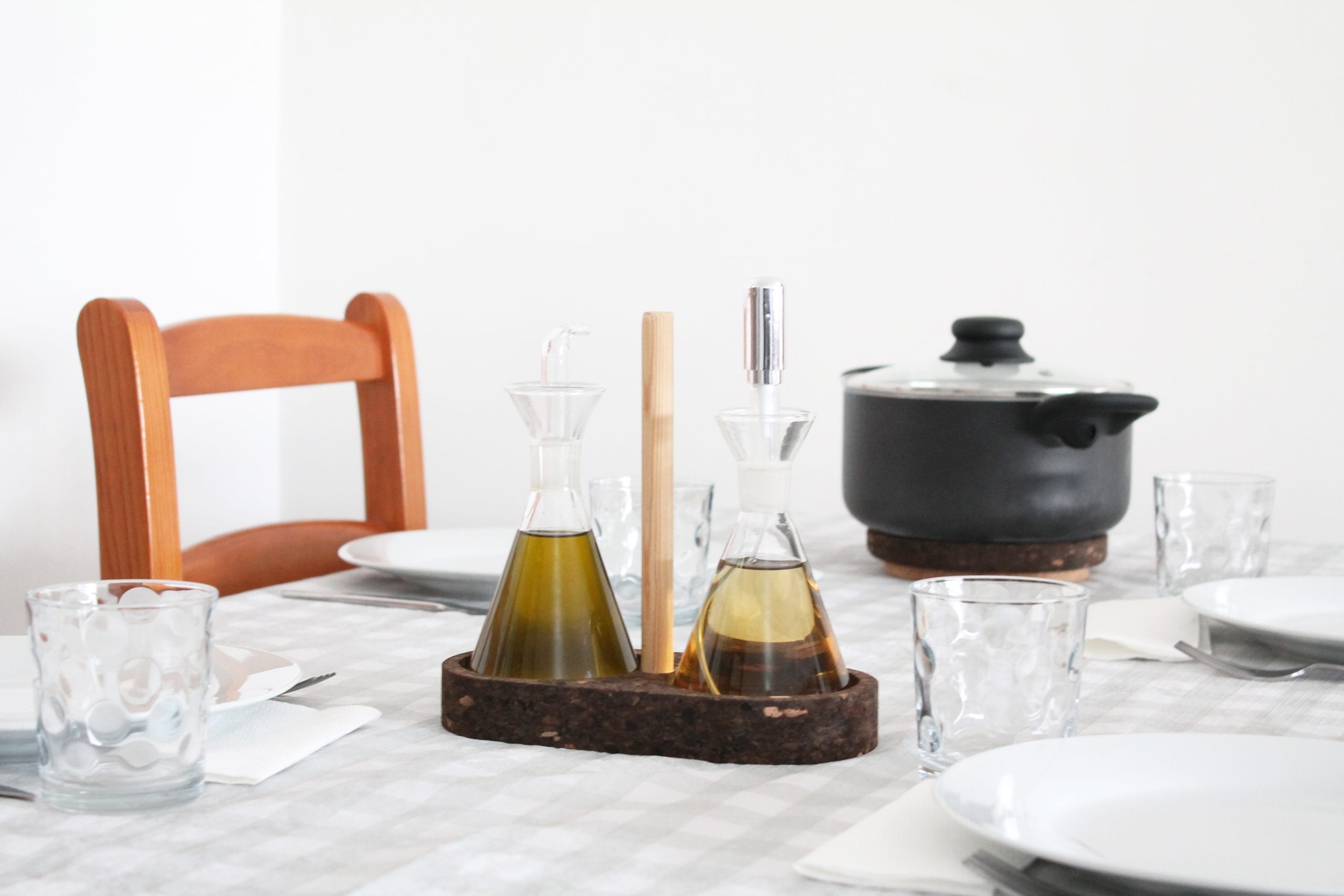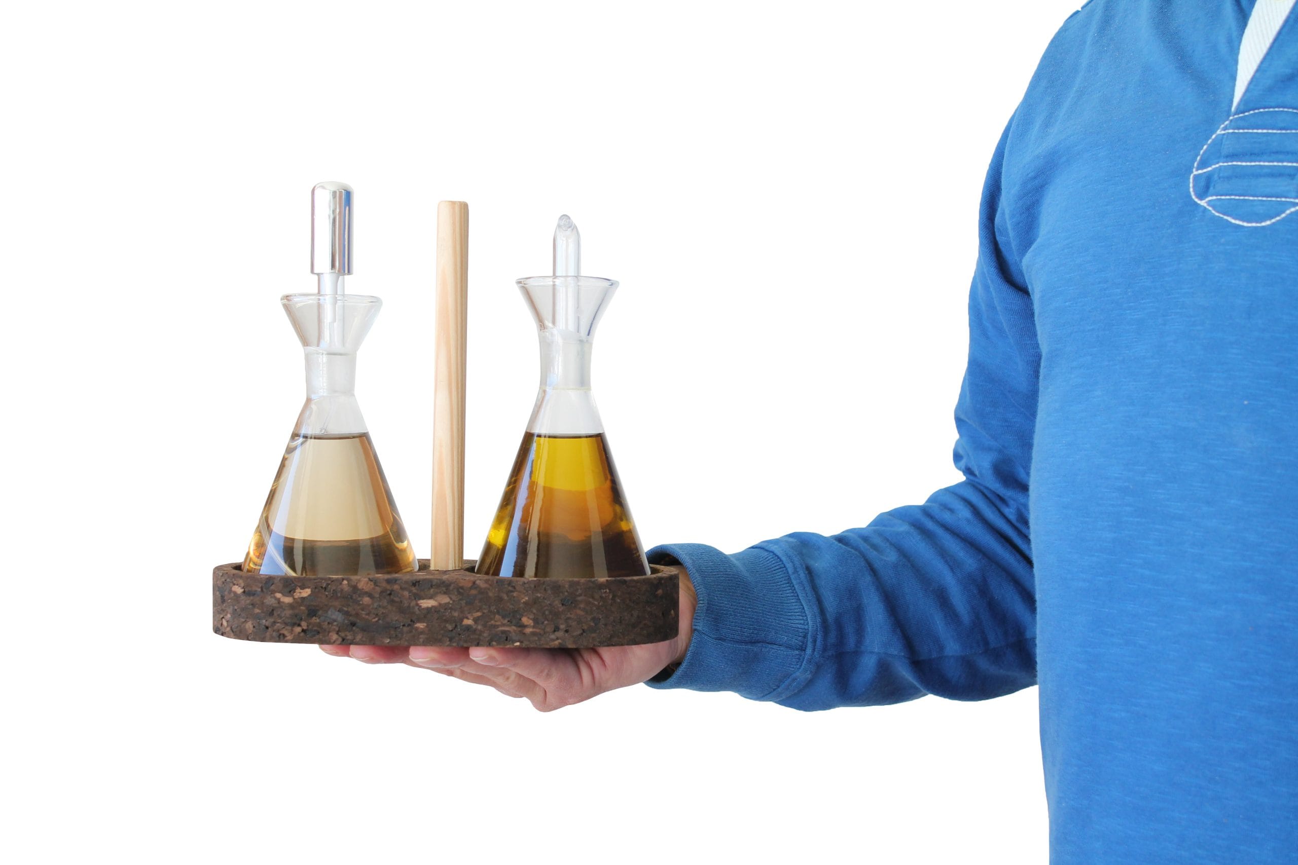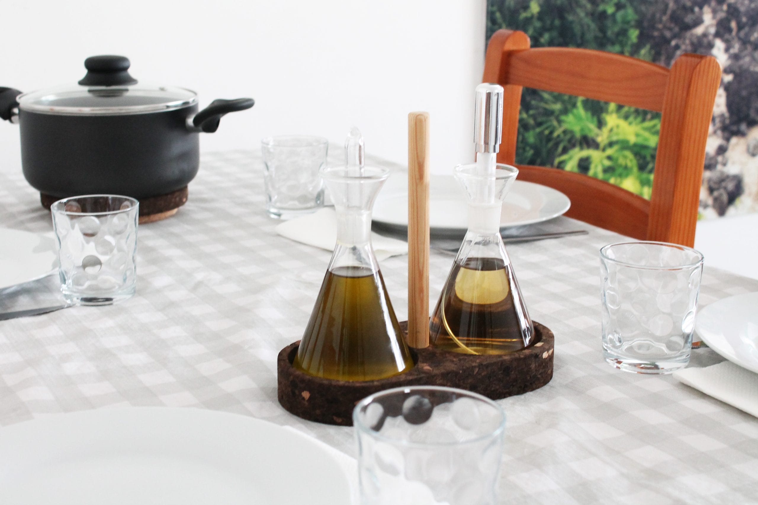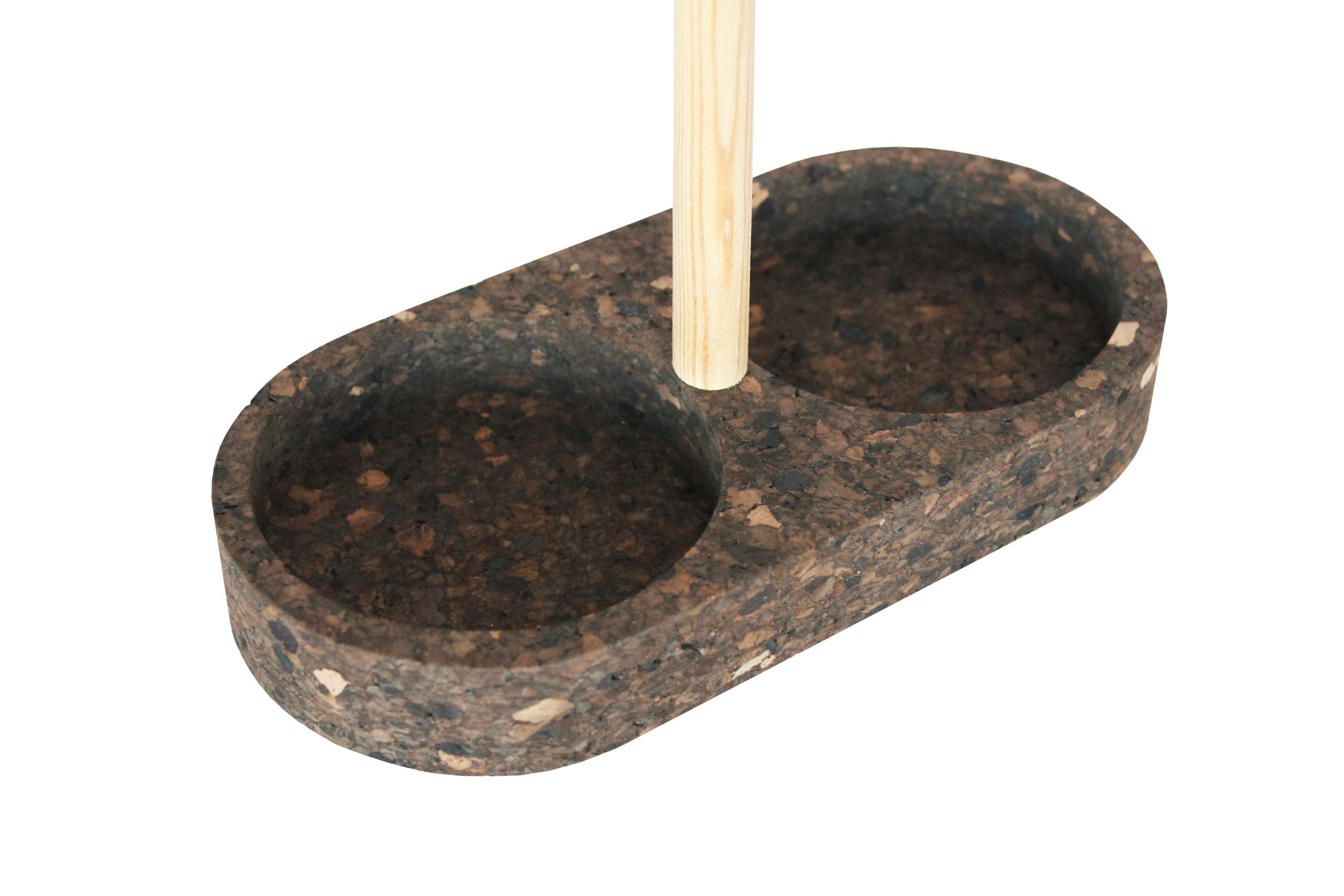 A cortiça é um material leve, resistente e renovável, conhecido pelas suas propriedades isolantes e conforto tátil. A utilização de cortiça neste galheteiro não só revela um compromisso com práticas sustentáveis, como também oferece vantagens funcionais importantes: a textura natural ajuda a proteger as superfícies de apoio, reduzindo o risco de humidade ou calor deixarem marcas, e confere uma sensação agradável ao toque.