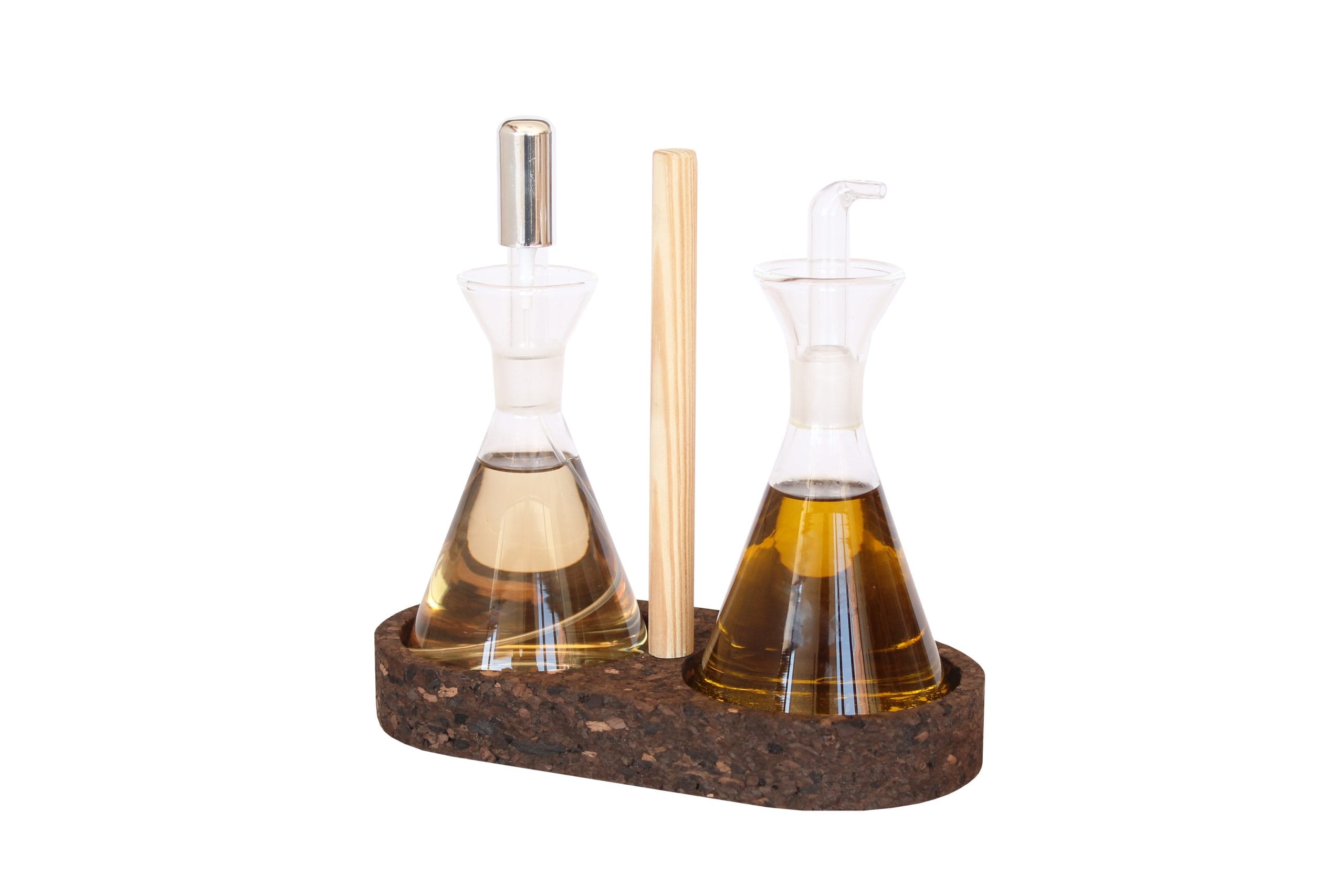 A cortiça, além de ser um recurso renovável de baixa pegada ambiental, é também naturalmente isolante. Esta característica torna o galheteiro útil para proteger a superfície onde está colocado, minimizando possíveis marcas causadas por frascos húmidos ou ligeiramente húmidos após o uso. A textura antiderrapante da cortiça ajuda ainda a manter o galheteiro estável e seguro, mesmo em superfícies lisas.