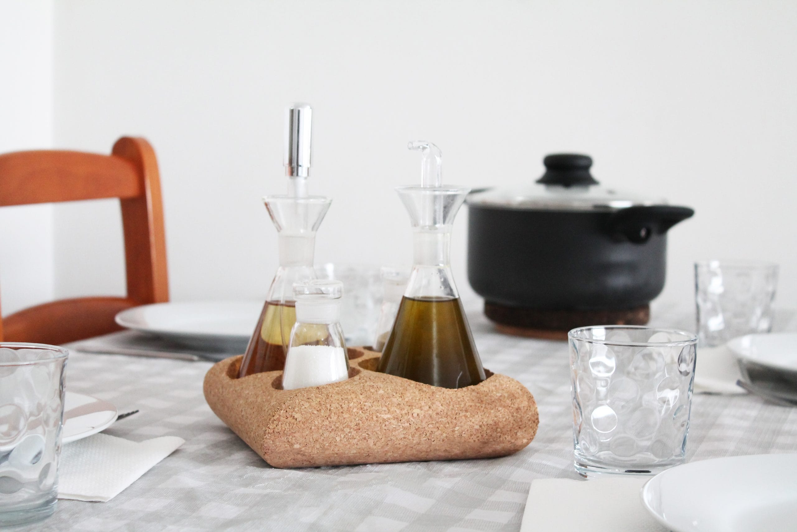 A cortiça natural confere ao galheteiro uma série de vantagens funcionais. A sua leveza facilita o transporte e reposicionamento conforme necessário, enquanto a robustez garante durabilidade ao longo do tempo, mesmo com utilização frequente. As propriedades isolantes da cortiça protegem as superfícies de desgaste causado pelo calor ou pela humidade, promovendo um ambiente de cozinha mais seguro e organizado.