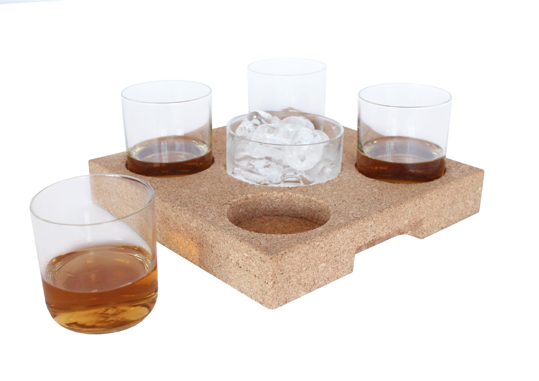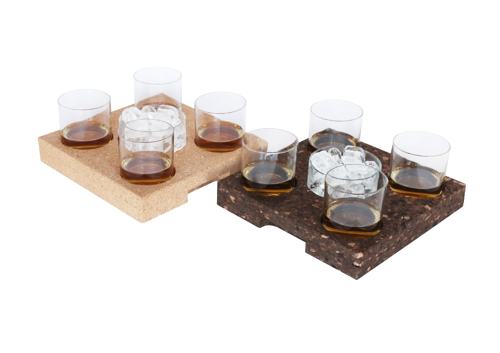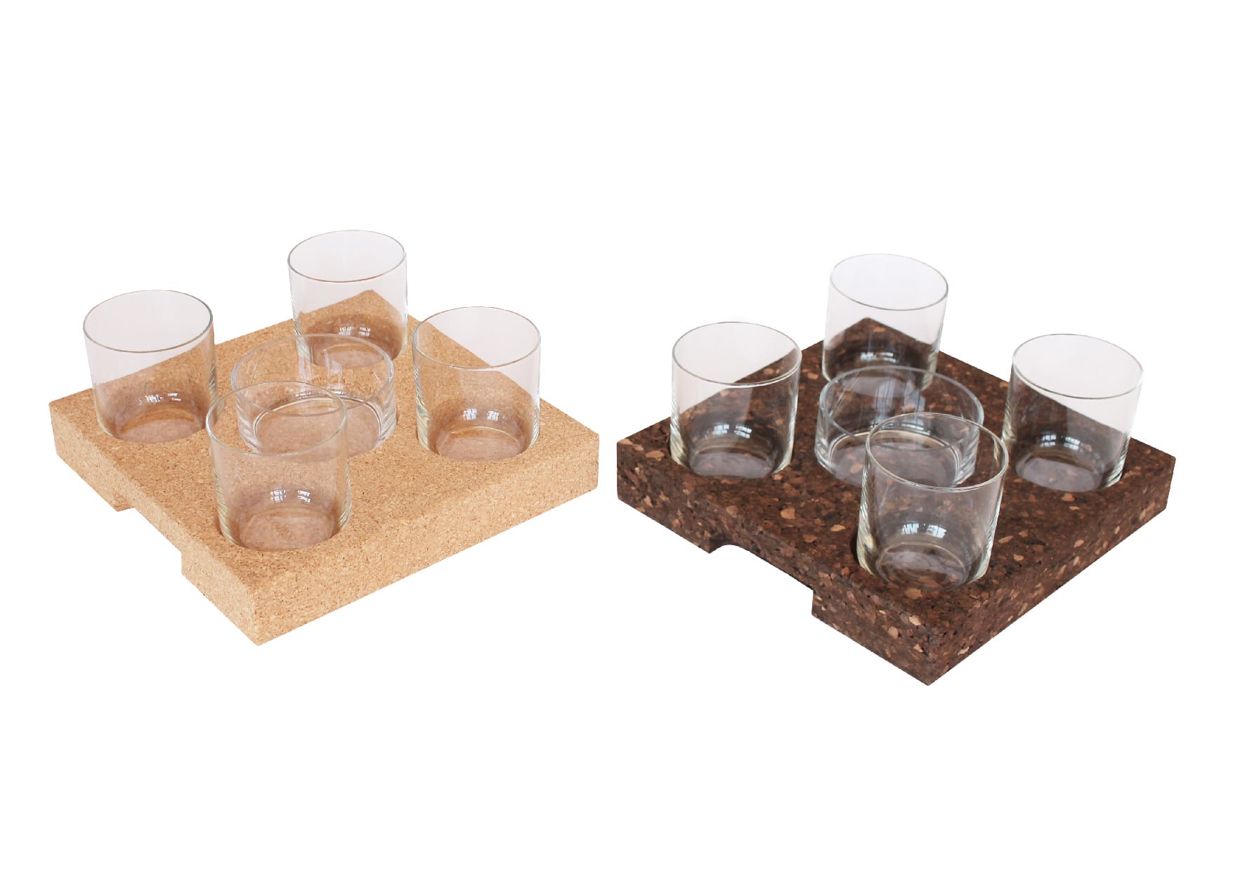 O conjunto combina um tabuleiro multifuncional com copos complementares, oferecendo uma solução versátil para servir bebidas, snacks, petiscos e outras iguarias, seja em refeições descontraídas ou em ocasiões mais formais. A cortiça, como material base, confere leveza, resistência e conforto ao toque, tornando o conjunto fácil de manipular e transportar.