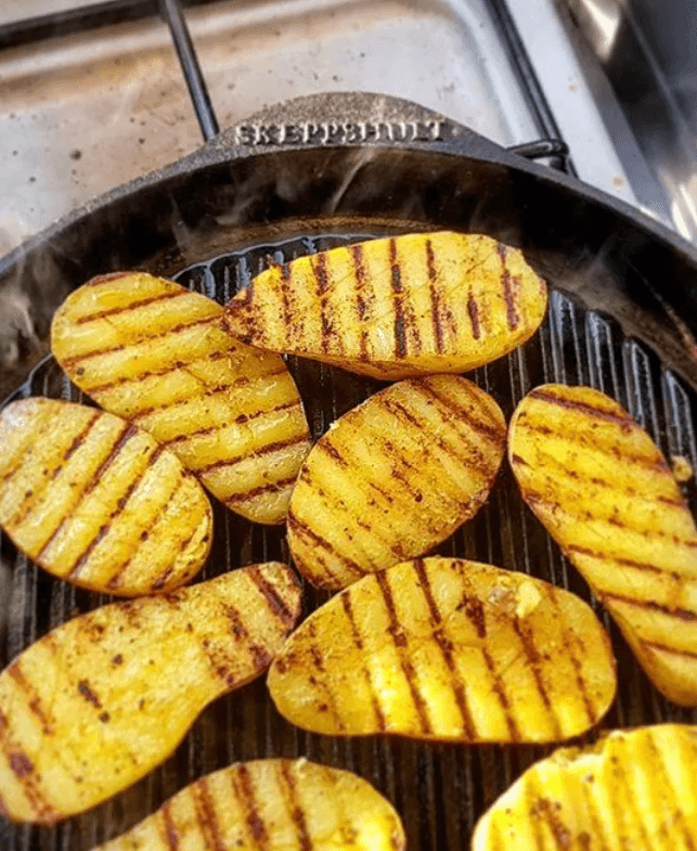 Ferro fundido maciço com base espessa de 5 mm, que assegura condução de calor uniforme e retenção térmica superior, ideal para grelhar alimentos com precisão.