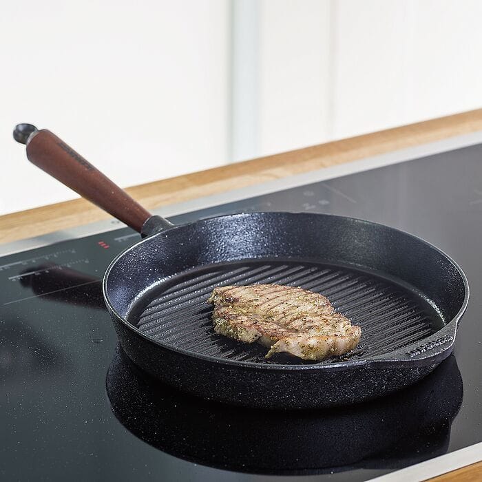 Grelha de ferro fundido 28 cm com cabo em madeira de nogueira, ideal para grelhar carnes, peixe, legumes e mais, proporcionando selagem superior e distribuição de calor uniforme em todas as fontes de calor, incluindo indução.