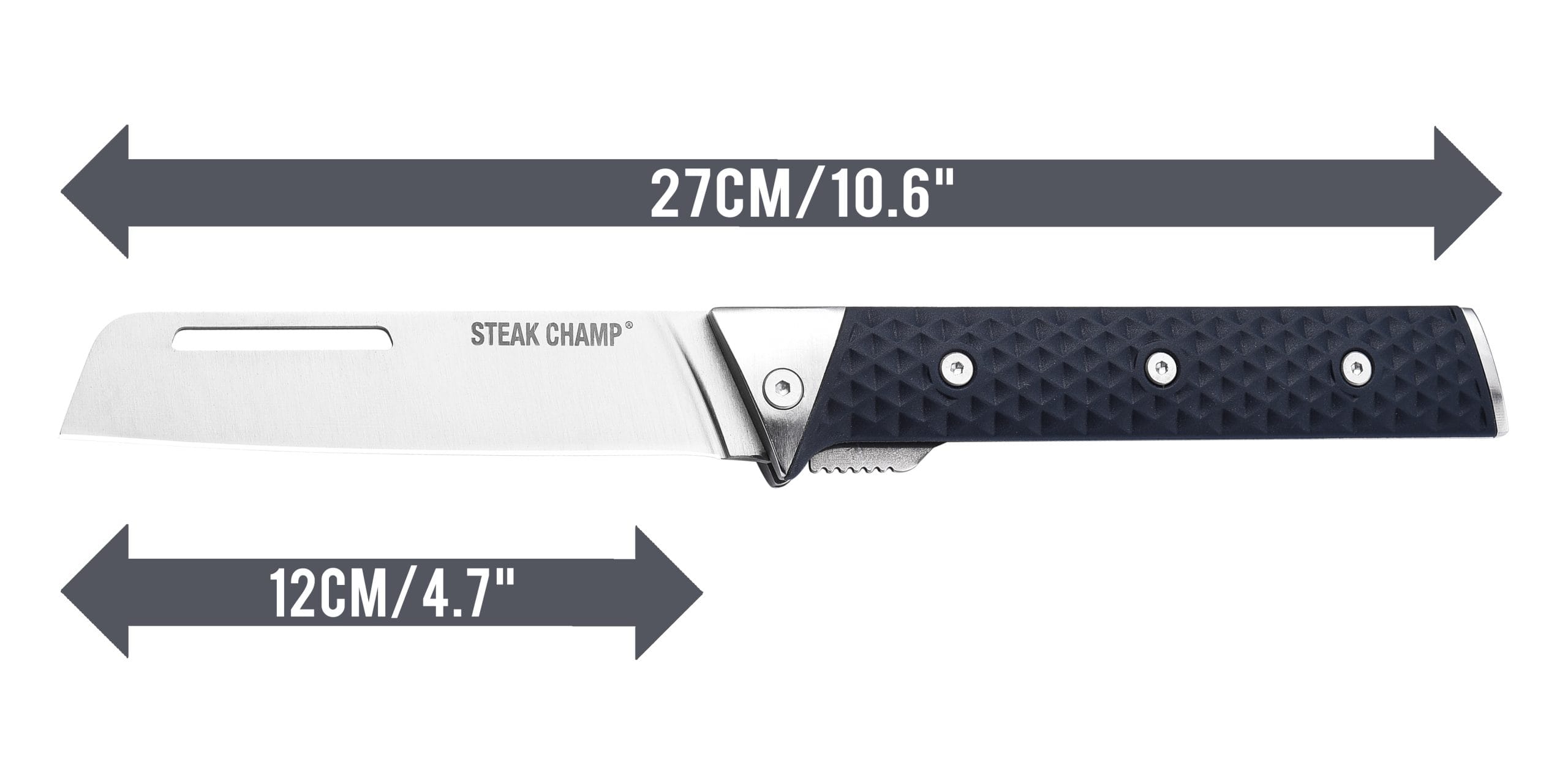 A Steak Champ Faca Dobrável Outdoor Chef BBQ Master 12cm é o companheiro perfeito para todas as suas aventuras culinárias ao ar livre e em acampamentos.