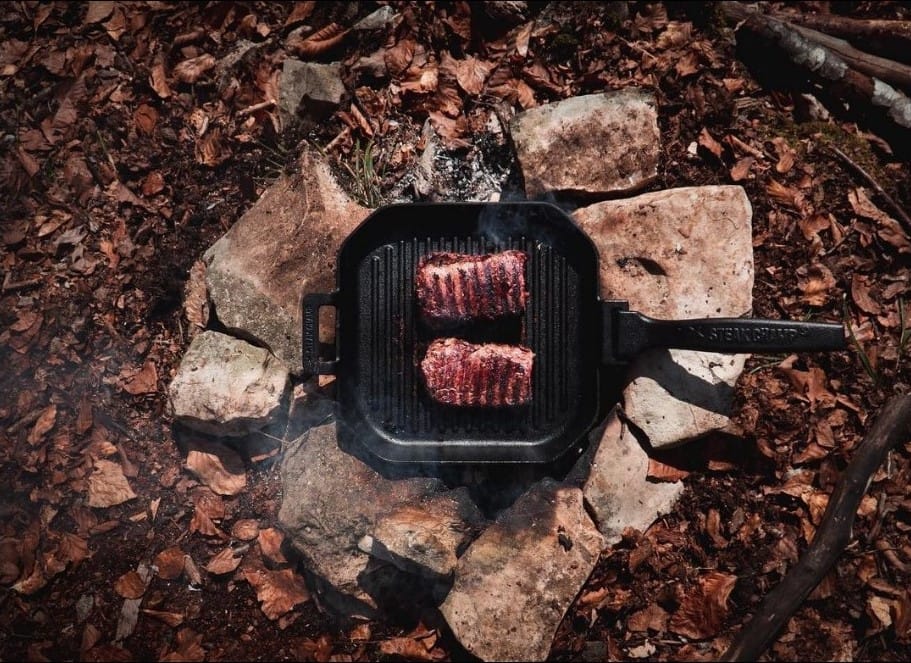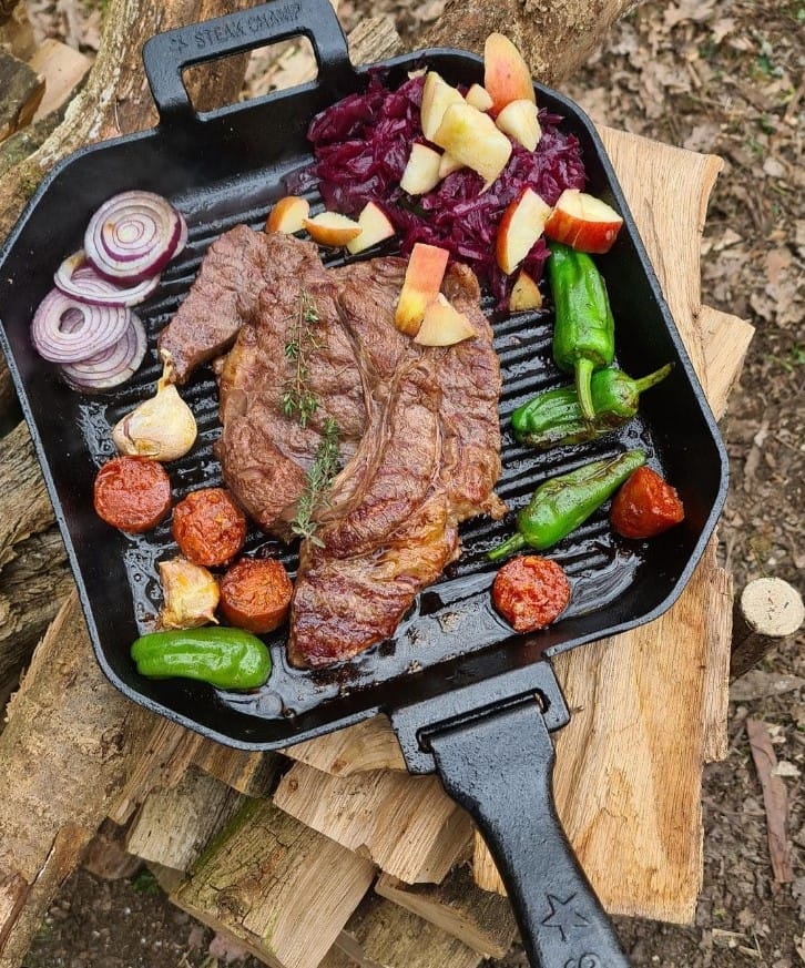 Esta clássica e intemporal Steak Champ Grelhador/frigideira em ferro fundido 26x26cm apresenta não só um design moderno, mas também uma pega amovível única. Retire a pega quando estiver a cozinhar, a servir na mesa ou a guardar. Salteie, frite ou coza as suas refeições no forno, no fogão, no grelhador ou numa fogueira. A frigideira possui nervuras para grelhar que elevam os alimentos e recolhem os pingos da cozedura. Estas nervuras foram concebidas para facilitar a limpeza. A frigideira está temperada em fundição e pronta a utilizar.